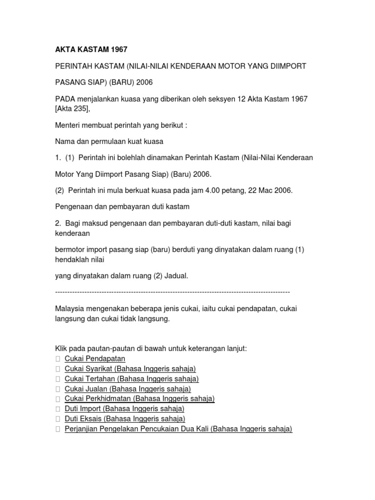 Akta Kastam 1967 Paul Akta Kastam 1967 Perintah Kastam Nilai Nilai Kenderaan Motor Yang Diimport Pdf Document