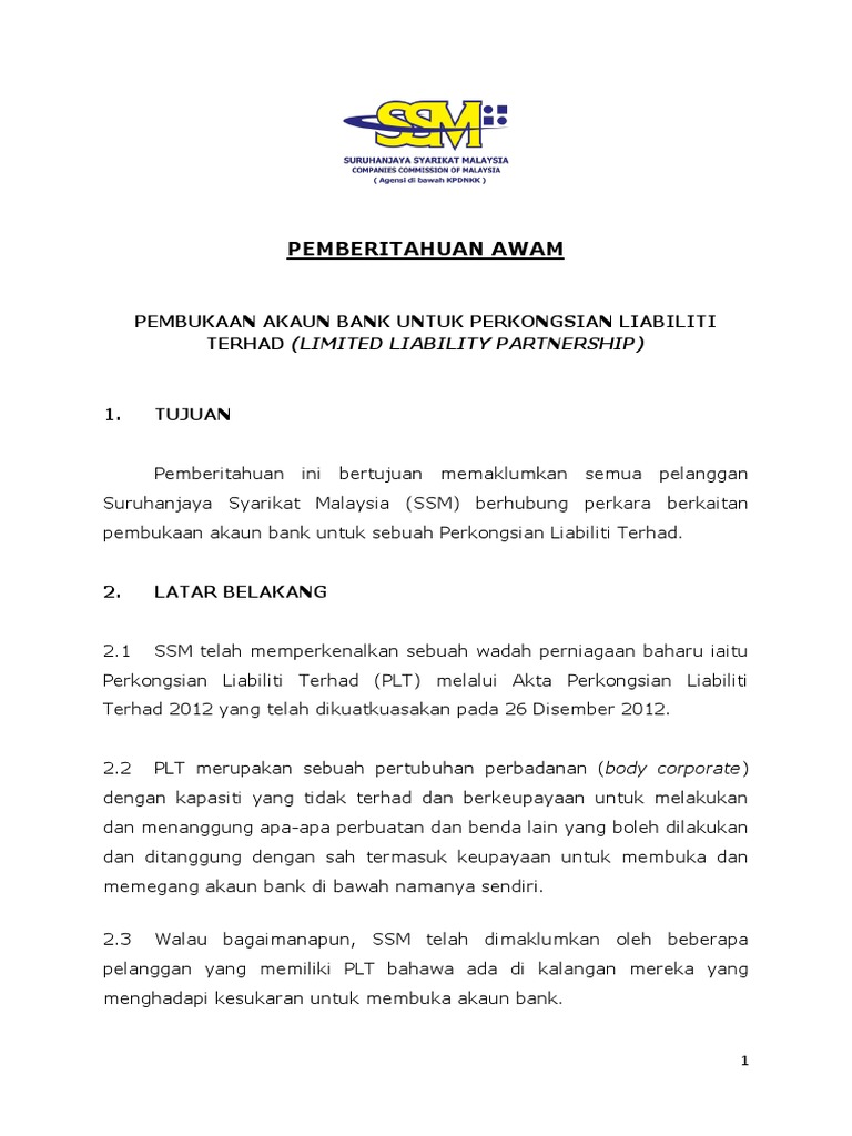 Pdf Pemberitahuan Awam Pembukaan Akaun Bank Untuk Perkongsian Liabiliti Terhad Limited Liability Partnership Zek Zamre Academia Edu