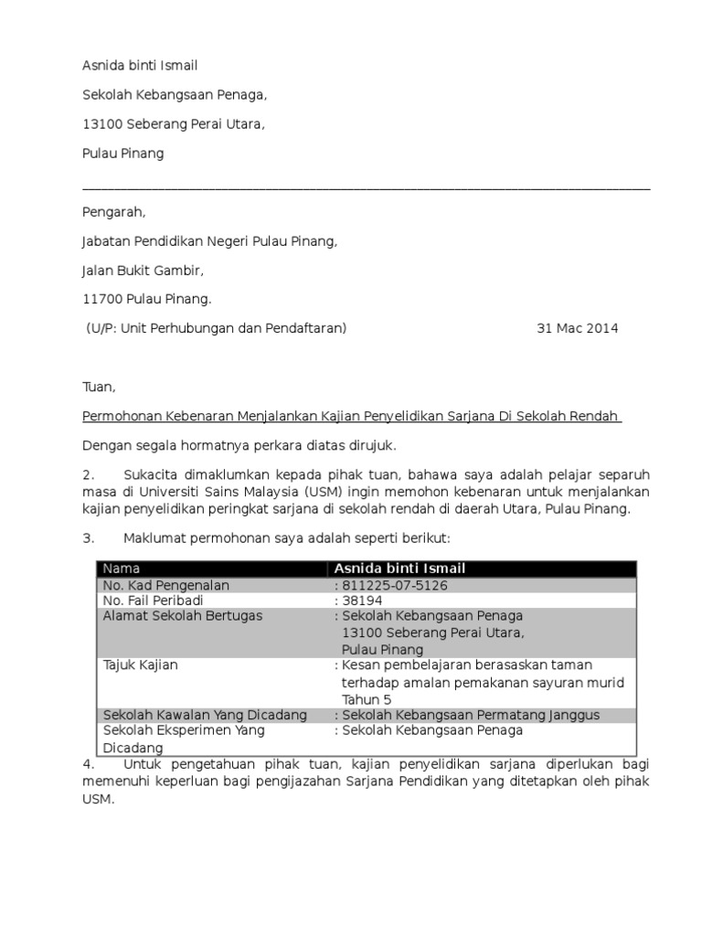 Permohonan Kebenaran Menjalankan Kajian Penyelidikan Sarjana Di Sekolah Rendah