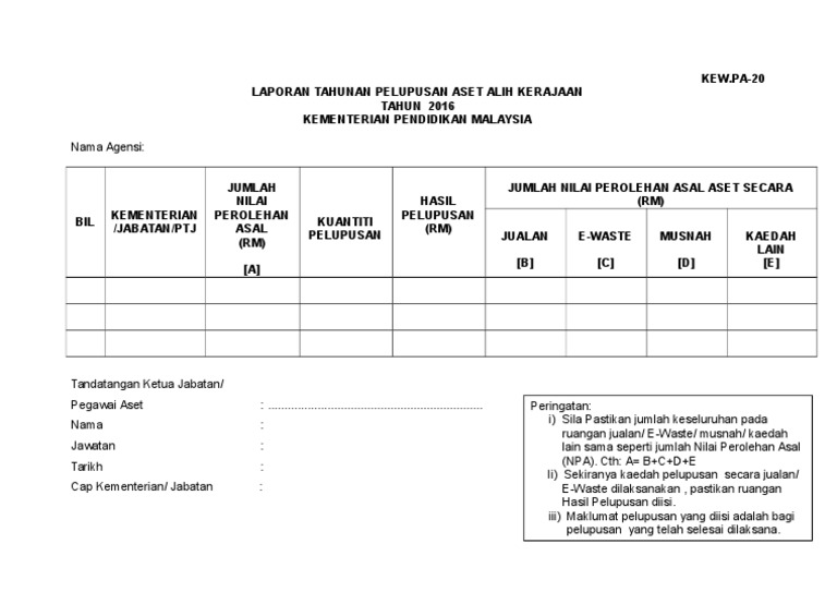 7 Lampiran Kew Pa 20 Laporan Tahunan Pelupusan Aset Alih Kerajaan