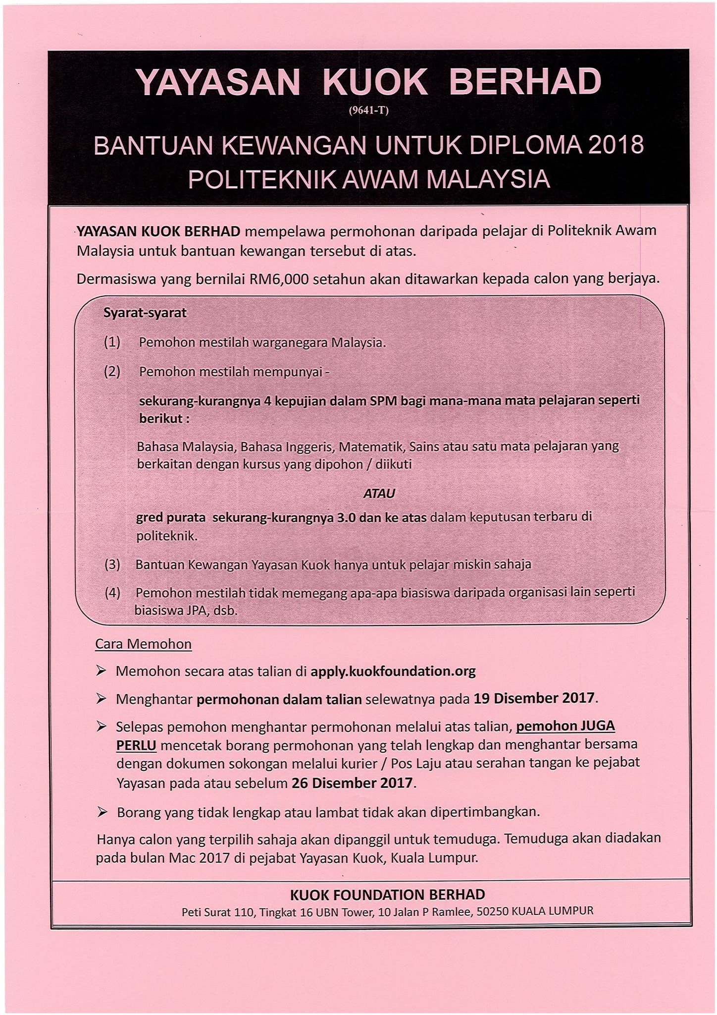 Jtmk Psis Di Twitter Mohon Segera Kuok Foundation Tarikh Tutup 19 12 17 Calon Yang Berjaya Akan Mendapat Biasiswa Rm6 Ribu Setahun 4 Kredit Spm Atau Hpnm 3 00 Ke Atas Mohon