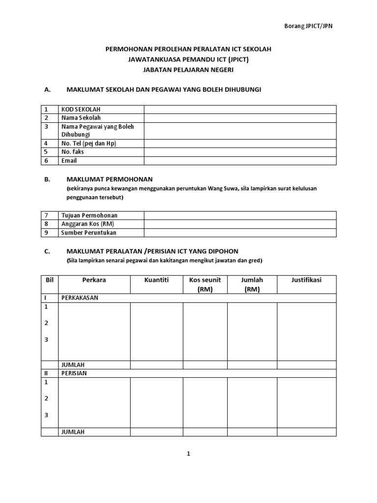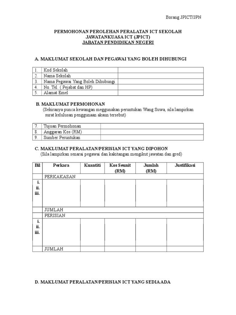 Borang Jpict Jpn Permohonan Peralatan Ict Untuk Sekolah Harian Sahaja Doc Borang Jpict Jpn Permohonan Perolehan Peralatan Ict Sekolah Jawatankuasa