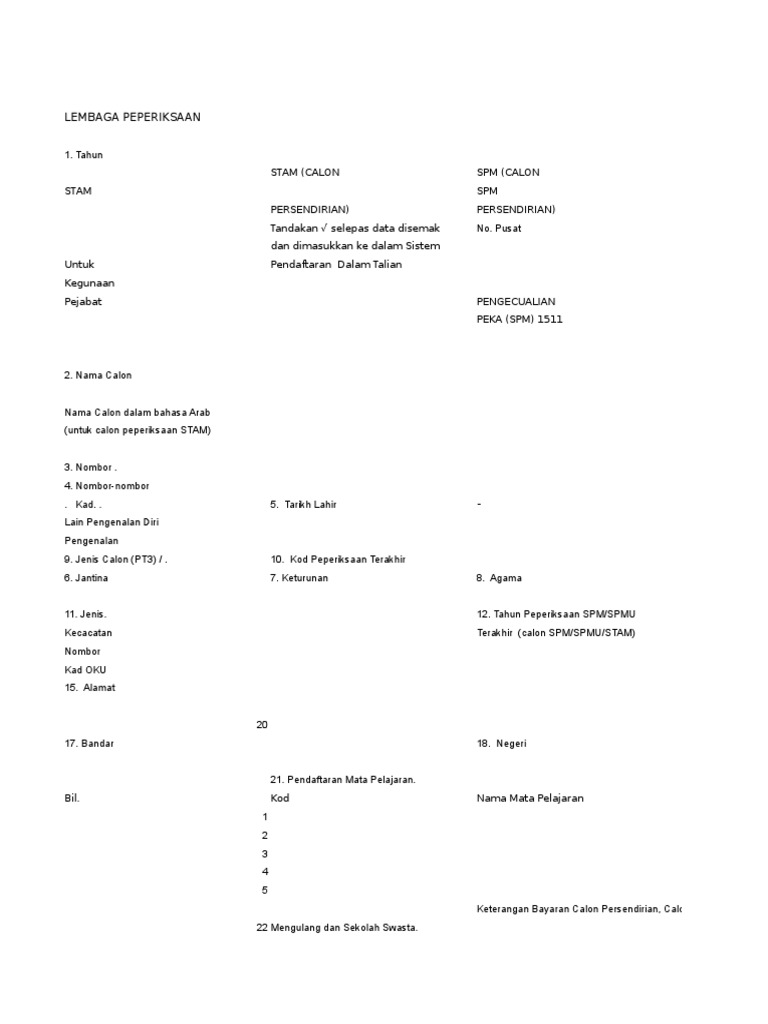 Borang Pendaftaran Stam Spm Pt3 Upsr Pasr Upba 1 1 Calon Pekak Dan Bisu 1 2 Telah Lulus Ulkcp Plbs