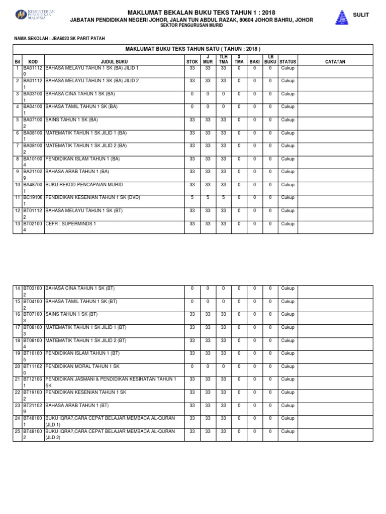 Maklumat Bekalan Buku Teks Tahun 1 2018