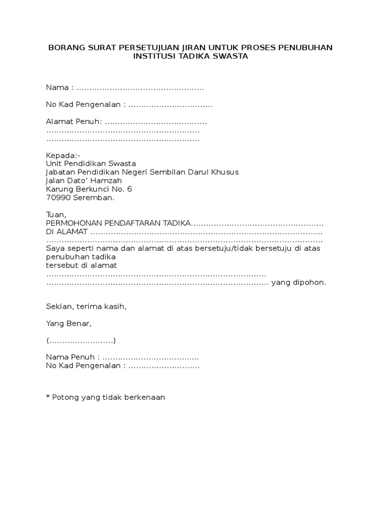 Borang Surat Persetujuan Jiran Untuk Proses Penubuhan