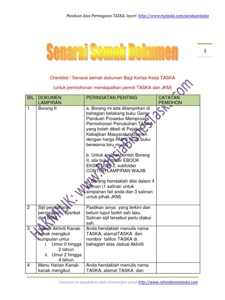 Senarai Semak Dokumen Untuk Pendaftaran Taska
