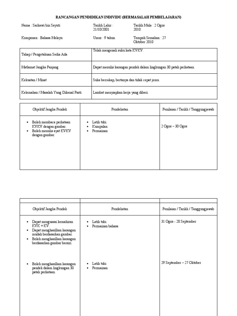 Contoh Rancangan Pengajaran Individu Pendidikan Khas Bahasa Malaysia Tahun 2 Kssr