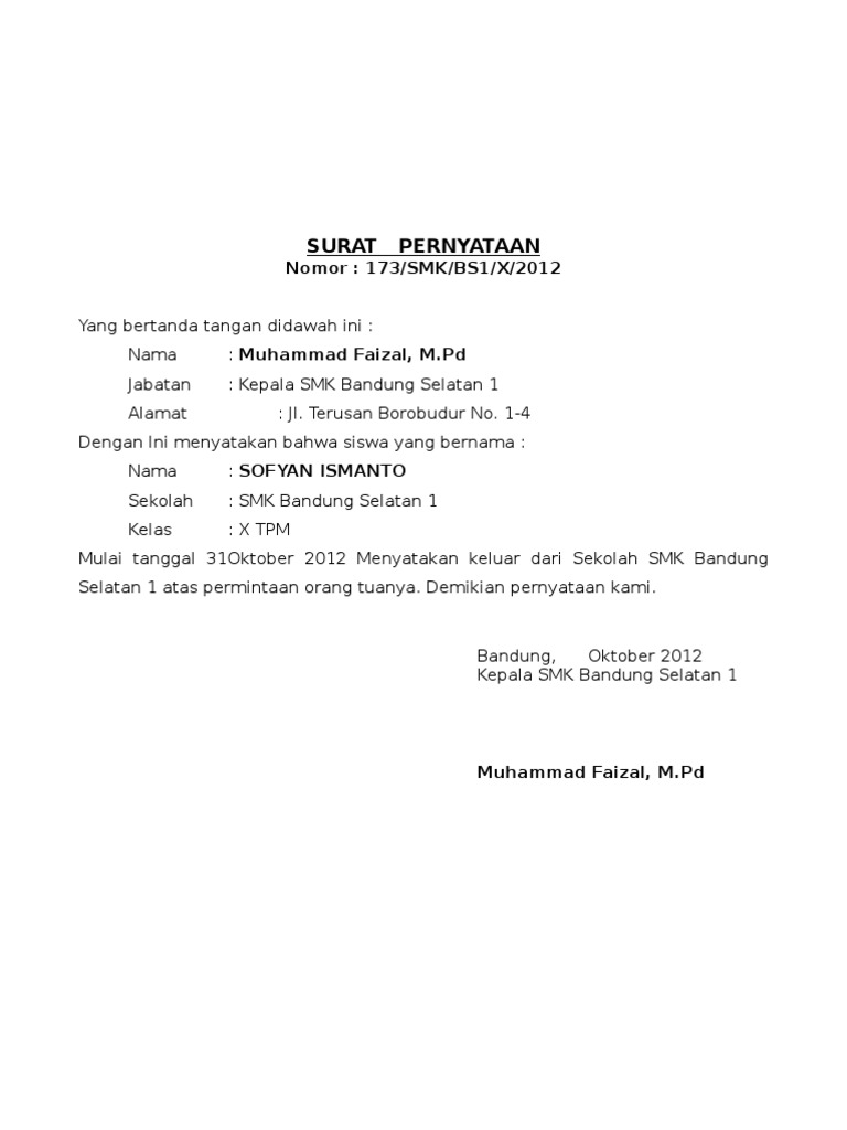 Doc Contoh Surat Pernyataan Pengunduran Diri Siswa Raniah Nur Sahar Academia Edu