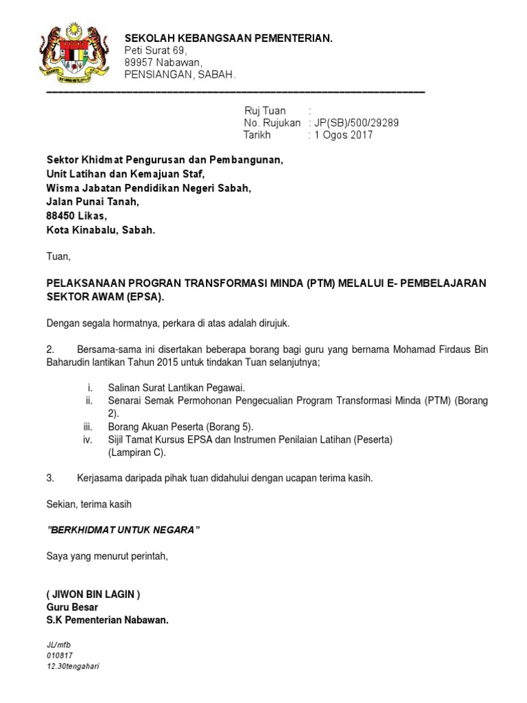 Contoh Surat Iringan Permohonan Ptm