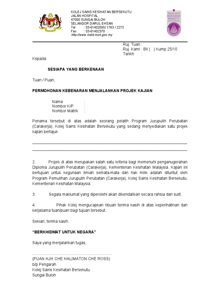 Contoh Surat Rasmi Memohon Kebenaran Membuat Kajian