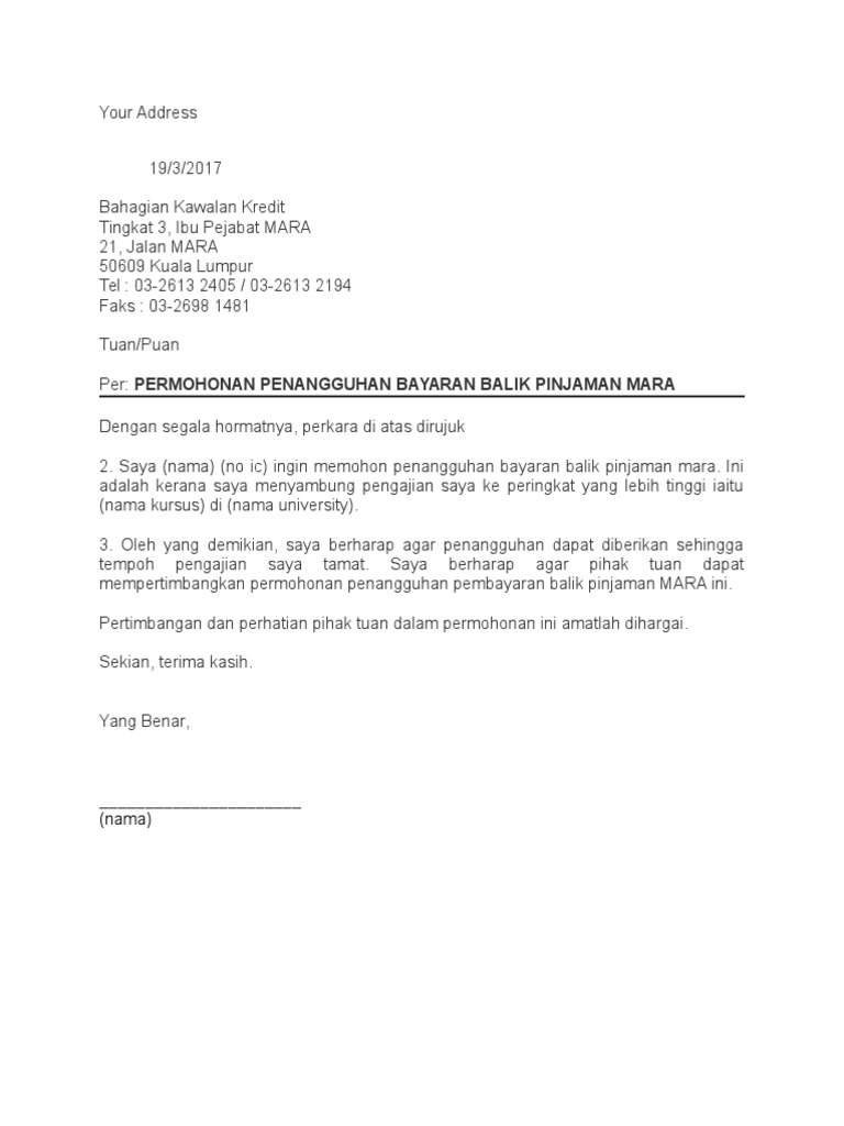 Contoh Surat Penangguhan Bayaran Balik Mara