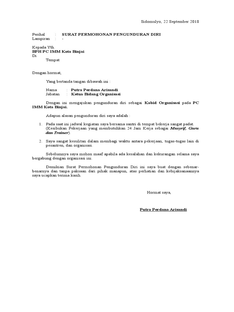 31 Contoh Surat Pengunduran Diri Surat Resign Kerja Dengan Alasan