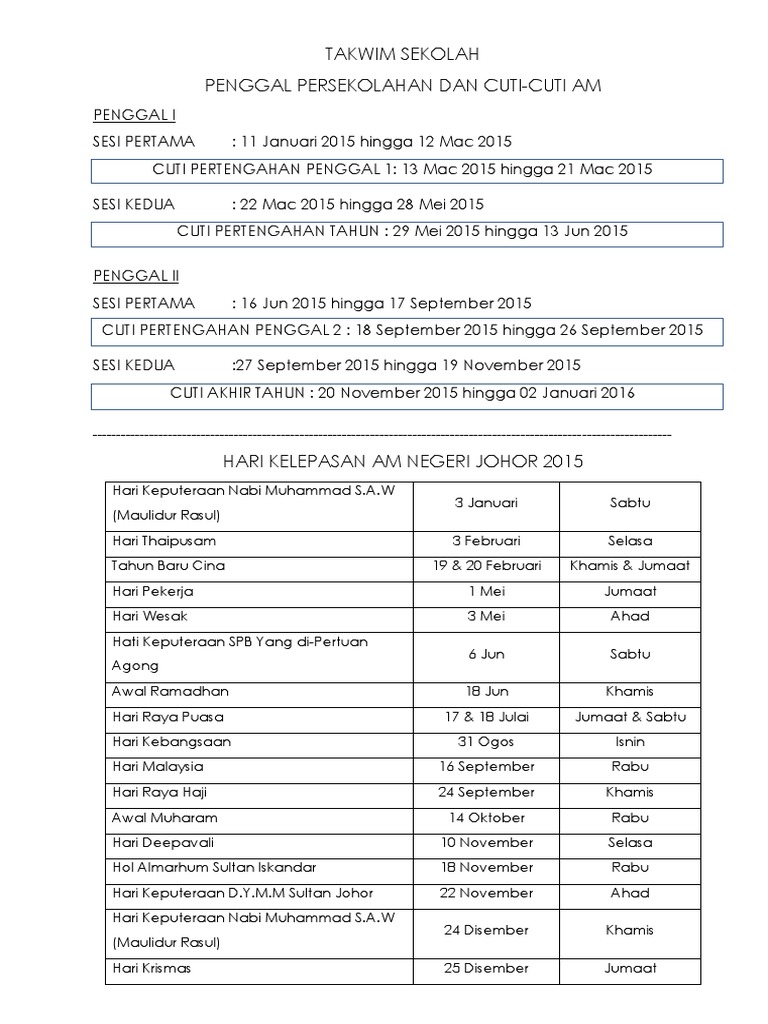 Kalendar Cuti Sekolah Negeri Johor 2018 Kronis B