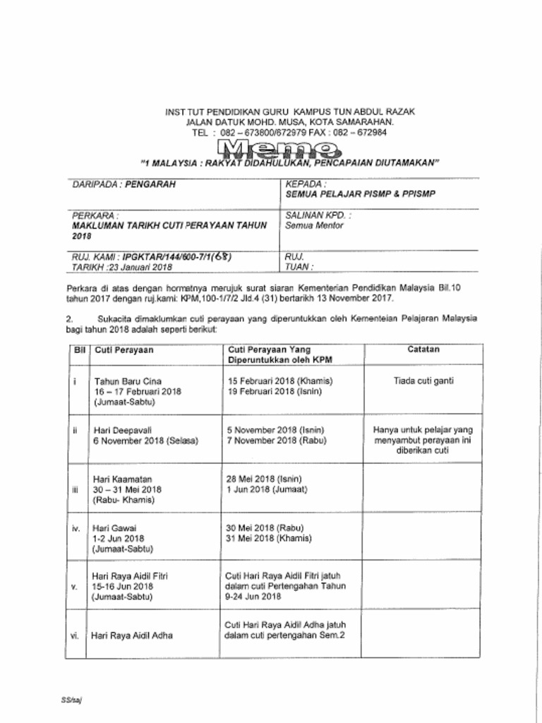 Memo Cuti Perayaan Tahun 2018 Bagi Pelajar Pdf