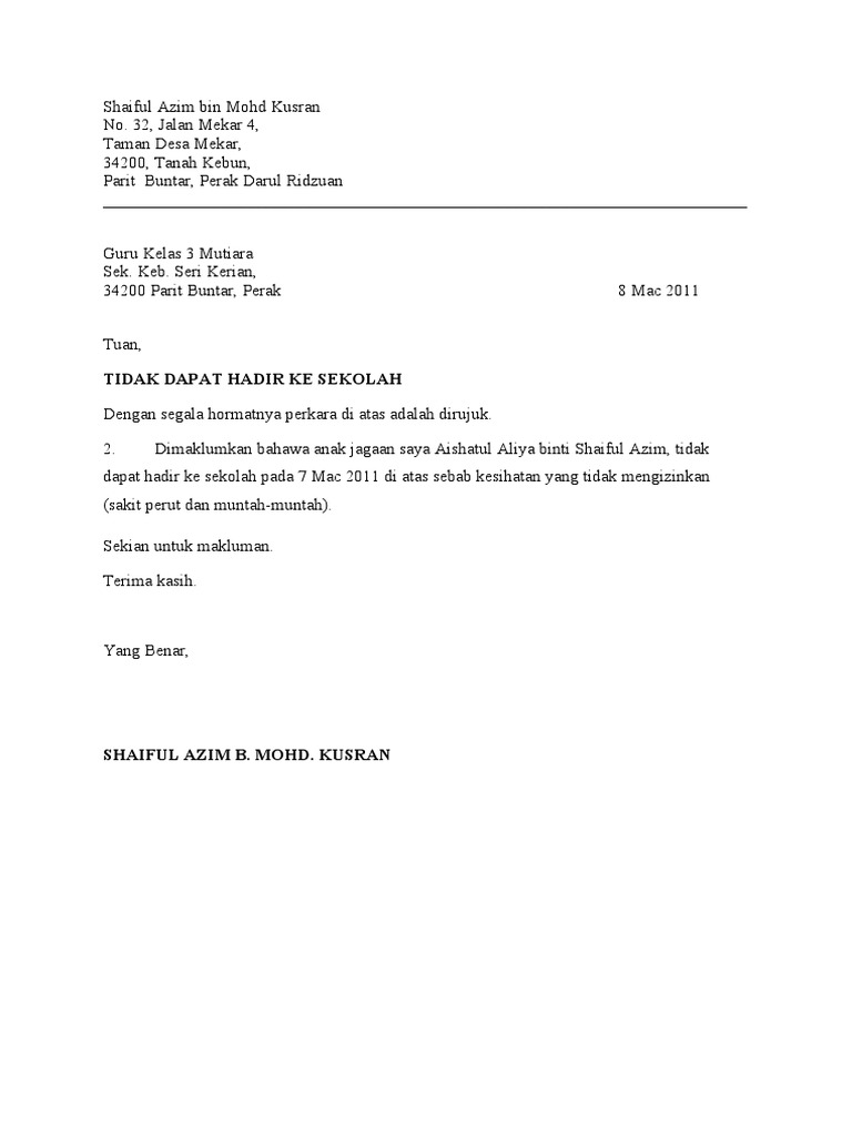 Contoh Surat Rasmi Cuti Sakit Sekolah Menengah Surasmi G