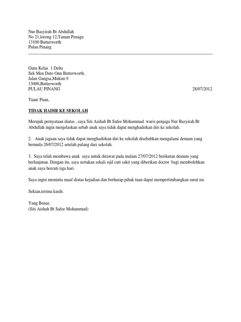 Contoh Surat Tidak Hadir Ke Sekolah Dengan Pelbagai Alasan Yang Munasabah