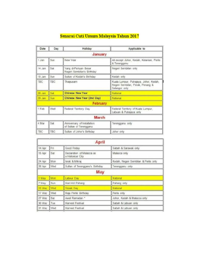 Tarikh Cuti Umum Cuti Panjang Di Malaysia 2017